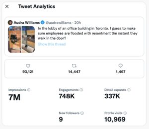 “I thought the signs were not very nice to those people who were starting to go back to the office” wrote Audra Williams who shared the images of the signs on Twitter told CTV News. Her post went viral: more than 7 millions of views (here below).