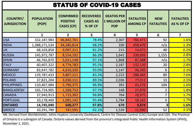 Here we provide a daily update of the data available for select countries and jurisdictions as of November 1, 2021, at 4:30 pm EST.