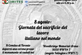 TORONTO – Il Comites della circoscrizione consolare di Toronto invita la cittadinanza a partecipare all’importante commemorazione per onorare la memoria dei lavoratori italiani nel mondo in occasione della giornata dell’8 agosto… Read More in Corriere Canadese >>>