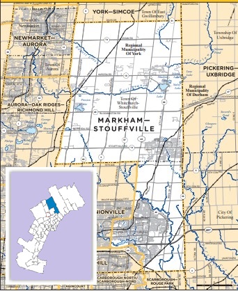 Created in 2012, Markham-Stouffville is a provincial electoral district that is part of the Regional Municipality of York. The riding encompasses the town of Whitchurch-Stouffville and the eastern portion of the Town of Markham, one of the most diverse communities in Canada.