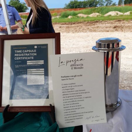 But that’s not all: inside the capsule, along with the messages of the boys, there is also a very special poem, “Let’s talk with the eyes” by the poet Agata De Nuccio, a sort of multilingual anthem (the poem has been translated into many languages, from Italian to Afrikaans, up to the language of the Canadian natives) that has embraced the world just when the world itself could no longer do so. Agata, born in Castrignano del Capo (Lecce), has lived for 40 years in Erbè (Verona) where she works in the social field and is a poet who, with her lyrics, has received acclaim and literary awards from a very young age. Our agency spoke about Agata’s poetry and literary activity in an interview (which you can read here: A poem in all languages to embrace the world).