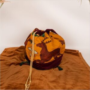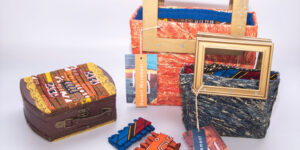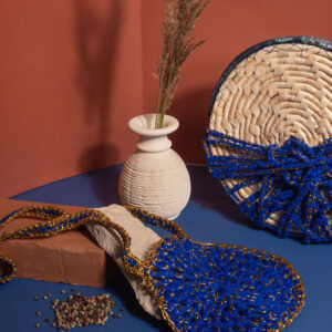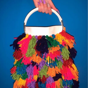 Altro elemento fondamentale da cui si è preso ispirazione sono le lunghe trecce che distinguevano una donna sposata da una nubile. Sono state create borse immaginando che fossero gli occhi e l’anima delle donne, consapevoli dei loro valori, desiderose di una riscoperta della loro identità più profonda. La borsa è stata interpretata con disegni e motivi geometrici caratteristici dell’architettura indo-islamica, che metaforicamente diventano finestre sull’infinito. I colori riprendono le brillanti tonalità del posto: turchese, rosso e smeraldo.