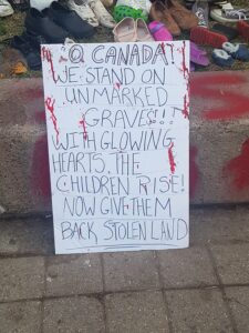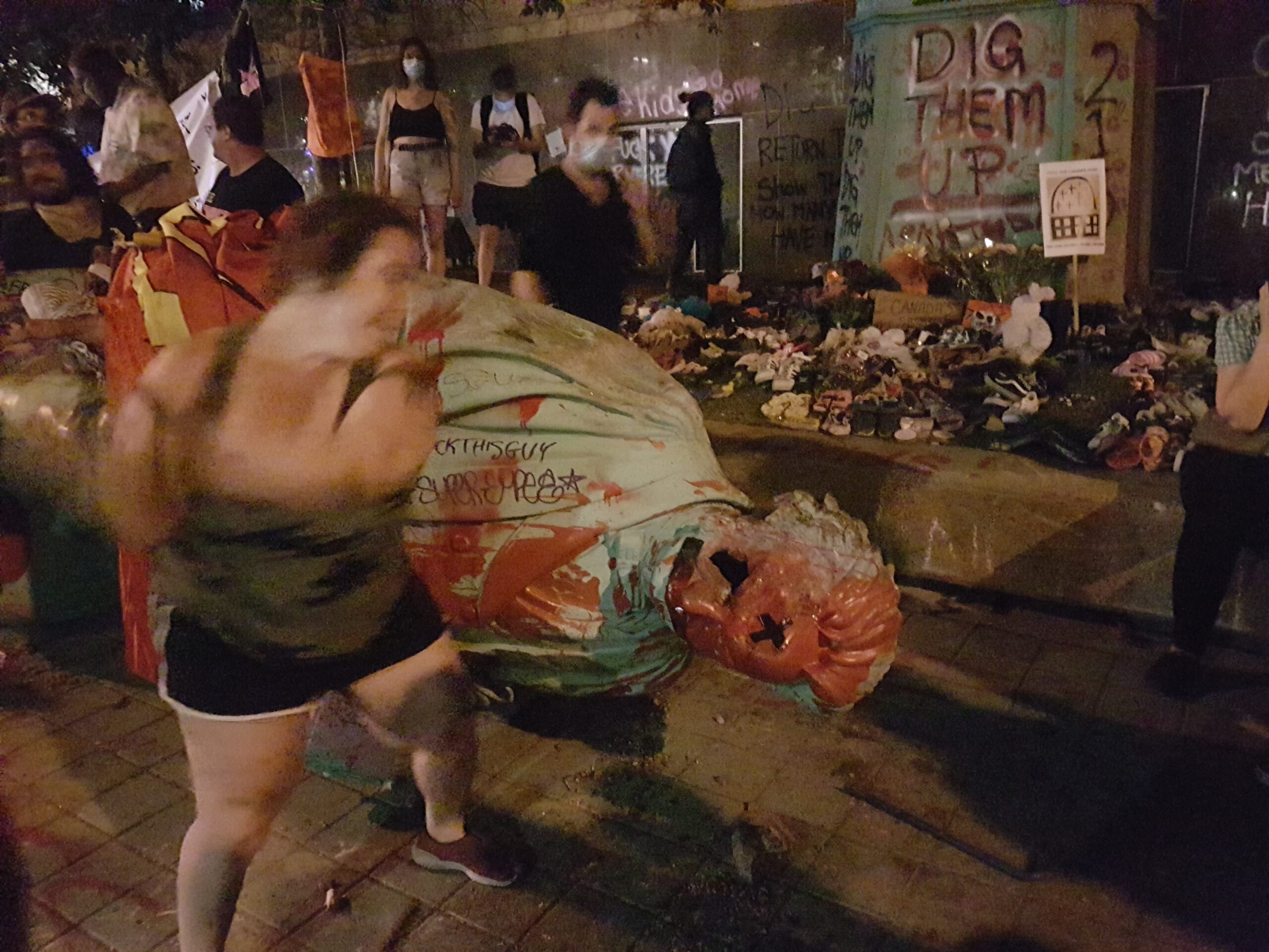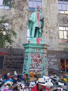 Basically in response to the announcement by the Tk’emlúps te Secwépemc First Nation on May 27 that preliminary findings from a survey conducted by a specialist in ground-penetrating radar indicated the remains of what could be 215 children buried on the site of a former residential school in Kamloops, B.C., the demonstrators get engaged to bring down the statue.