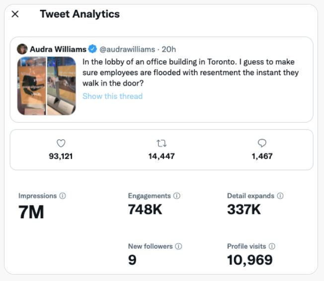 “I thought the signs were not very nice to those people who were starting to go back to the office” wrote Audra Williams who shared the images of the signs on Twitter told CTV News. Her post went viral: more than 7 millions of views (here below).