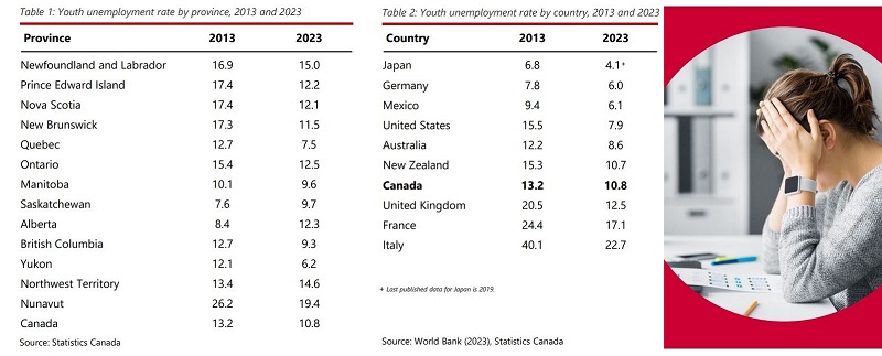 According to the Deloitte study, youth unemployment rates vary greatly across Canada. Looking at the 2023 data, it ranges from 19.4% in Nunavut to 6.2% in Yukon. The data also varies considerably from one country to another: Canada is positioned halfway between the G7 countries and the other selected OECD member counterparts.