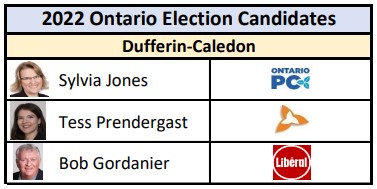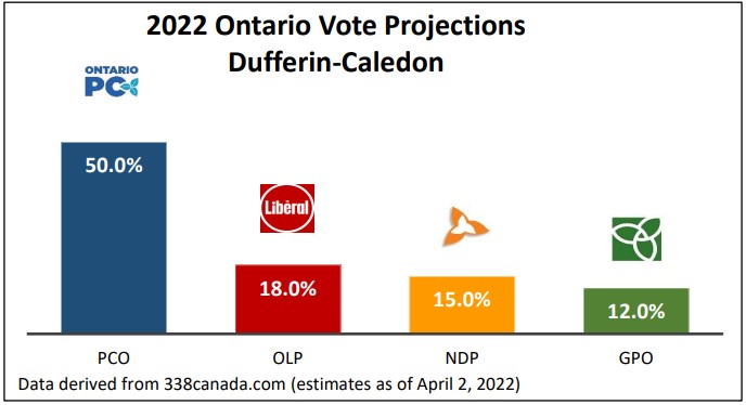 MPP Sylvia Jones has represented Dufferin-Caledon since it was created in 2007. As a member of the PC party, she is seeking re-election for her fifth term in office. Historically, electors have shown dedicated support for the PC party. In 2018, Jones won with 53% of the electorate (29,702 votes). The NDP took 20%. The margin of victory was 18,321 votes. The Green Party of Ontario (GPO) secured 12.5% of the vote and the Liberals came in just behind at 12.4%.