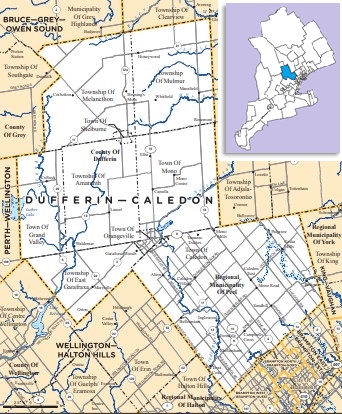 Dufferin-Caledon, provincial constituency, covers an area of about 2,300 square km, slightly less than that of Pisa, but with a population density about one third that of the Italian regional municipality. The district is located in central Ontario, north of Brampton and encompasses Dufferin County and the town of Caledon.