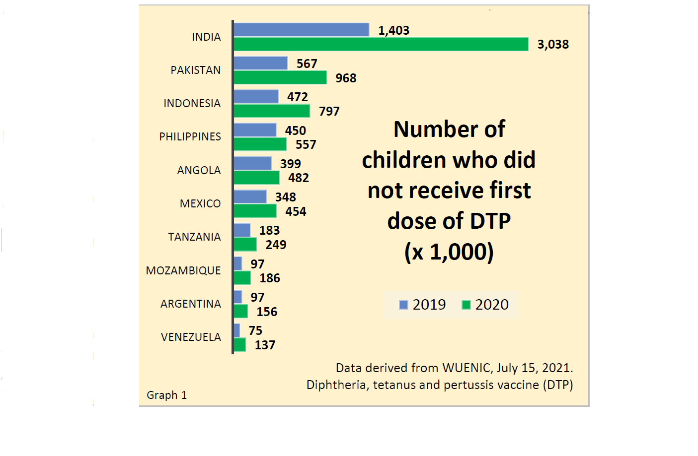For instance, India experienced the largest drop in number of children not receiving the first dose of the combination vaccine for diphtheria-tetanus-pertussis (DTP-1). In 2020, roughly three million children missed a crucial first dose of the DTP vaccine compared to 1.4 million in 2019, (see graph 1 above). That translates to a drop in fully vaccinated DTP coverage from 91% to 85%.