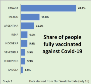 Inequity may be a mere understatement. Canada has procured more than 400 million Covid-19 vaccine doses, enough to vaccinated every resident ten times. According to Our World in Data (July 18), 49.7% of people in Canada are considered fully vaccinated against Covid-19. In India, that rate drops to 6.0% of the population who are fully vaccinated. That rate is even less in Angola where only 1.8% of the population have received the adequate dosage for protection against the virus. (graph 2 below)