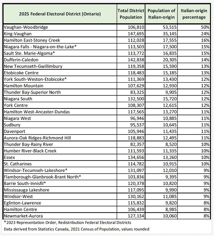 Siamo in piena campagna elettorale. Il grafico qui sopra offre uno scorcio dei primi 30 collegi elettorali che gli italocanadesi chiamano casa. Da notare il numero in cui gli italiani superano i 10.000 abitanti o il 10% degli elettori…