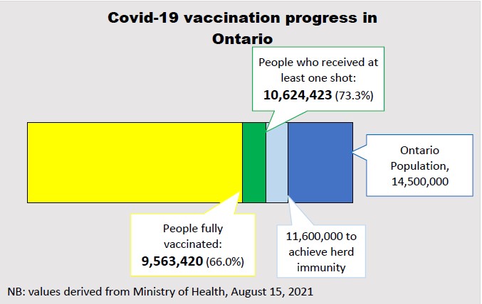 With the largest vaccination campaign underway, the province has administered more than 20.1 million doses into the arms of Ontarians. On August 15, numbers released by the Ministry of Health show health officials administered 40,907 vaccine doses on Sunday, down from 50,343 doses the day prior.