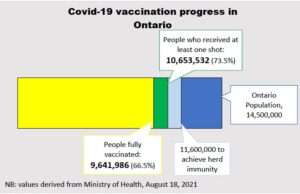 This graph represents Ontario’s progress thus far in the vaccination campaign (see above). The dark blue bar represents the population of Ontario, an estimated 14.5 million. Health officials suggest roughly 80% of the population would need to be vaccinated to achieve herd immunity against Covid-19.