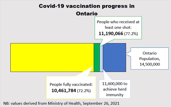 With the largest vaccination campaign underway, the province has administered more than 21.6 million doses into the arms of Ontarians. On September 26, numbers released by the Ministry of Health show health officials administered 37,645 vaccine doses on Saturday, down from 47,871 doses the day prior.