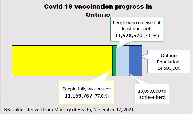This graph represents Ontario’s progress thus far in the vaccination campaign (see above). The dark blue bar represents the population of Ontario, an estimated 14.5 million. Health officials suggest the critical threshold for vaccination is now estimated to be at least 90% of the population. That translates to roughly 13,050,000 people that would need to be vaccinated to achieve herd immunity against Covid-19.