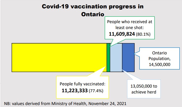 This graph represents Ontario’s progress thus far in the vaccination campaign (see above). The dark blue bar represents the population of Ontario, an estimated 14.5 million. Health officials suggest the critical threshold for vaccination is now estimated to be at least 90% of the population. That translates to roughly 13,050,000 people that would need to be vaccinated to achieve herd immunity against Covid-19.