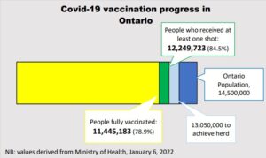 This graph represents Ontario’s progress thus far in the vaccination campaign (see above). The dark blue bar represents the population of Ontario, an estimated 14.5 million. Health officials suggest the critical threshold for vaccination is now estimated to be at least 90% of the population. That translates to roughly 13,050,000 people that would need to be vaccinated to achieve herd immunity against Covid-19.