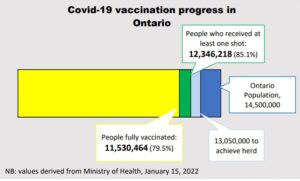 This graph represents Ontario’s progress thus far in the vaccination campaign (see above). The dark blue bar represents the population of Ontario, an estimated 14.5 million. Health officials suggest the critical threshold for vaccination is now estimated to be at least 90% of the population. That translates to roughly 13,050,000 people that would need to be vaccinated to achieve herd immunity against Covid-19.