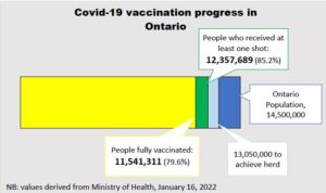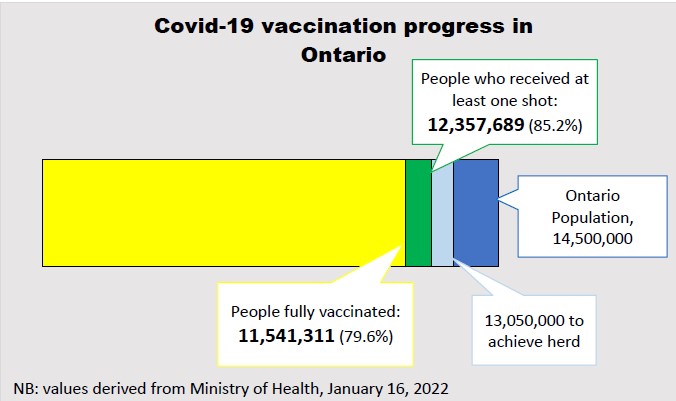 This graph represents Ontario’s progress thus far in the vaccination campaign (see above). The dark blue bar represents the population of Ontario, an estimated 14.5 million. Health officials suggest the critical threshold for vaccination is now estimated to be at least 90% of the population. That translates to roughly 13,050,000 people that would need to be vaccinated to achieve herd immunity against Covid-19.