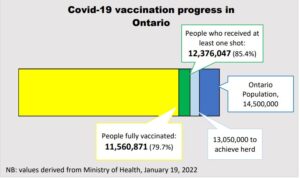 This graph represents Ontario’s progress thus far in the vaccination campaign (see above). The dark blue bar represents the population of Ontario, an estimated 14.5 million. Health officials suggest the critical threshold for vaccination is now estimated to be at least 90% of the population. That translates to roughly 13,050,000 people that would need to be vaccinated to achieve herd immunity against Covid-19.