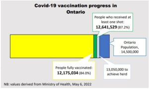 This graph represents Ontario’s progress thus far in the vaccination campaign (see above). The dark blue bar represents the population of Ontario, an estimated 14.5 million. Health officials suggest the critical threshold for vaccination is now estimated to be at least 90% of the population. That translates to roughly 13,050,000 people that would need to be vaccinated to achieve herd immunity against Covid-19.