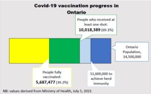 With the largest vaccination campaign underway, the province has administered more than 15.7 million doses into the arms of Ontarians. On July 5, numbers released by the Ministry of Health show health officials administered 144,795 vaccine doses on Sunday, down from 196,068 doses the day prior.