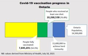 With the largest vaccination campaign underway, the province has administered more than 18.1 million doses into the arms of Ontarians. On July 18, numbers released by the Ministry of Health show health officials administered 134,654 vaccine doses on Saturday, down from 169,103 doses the day prior.