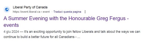 It is not known whether the “partial” Fergus (who took Rota’s place) will do the same: what is certain is that the material relating to the June 4th event with the Speaker disappeared from the Liberal Party website: by searching, today, on Google “Summer evening with the Honorable Greg Fergus”, the link appears with the reference to the evening but that link corresponds to a removed page… (see the screenshot below)
