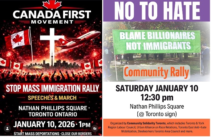 According to a statement released Sunday by the Toronto Police Service, officers were deployed around 2 p.m. to Nathan Phillips Square, at the intersection of Queen Street West and Bay Street, where dozens of people had gathered to protest mass immigration. The rally, organized through a social media campaign promoted by the “Canada First” movement, quickly drew a counter-protest as well as a news conference involving city councillors and groups opposing the demonstration. Ahead of the event, City Councillor Neethan Shan (Scarborough–Rouge Park), together with organizations such as the National Council of Canadian Muslims and the Urban Alliance on Race Relations, had denounced racism and xenophobia, according to the Toronto & York Region Labour Council. Then, the counter-demonstration by Community Solidarity Toronto (an acronym that brings together all those opposed to “Canada First”) began to protest “against hate in the city.”