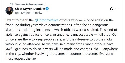 In a message posted on social media, Toronto Police Chief Myron Demkiw thanked officers who were on the front lines. “This kind of violence against police officers, or anyone, is unacceptable — full stop. Our officers are there to keep people safe, and they deserve to do their jobs without being attacked. As we have said many times, when officers have lawful grounds to do so, arrests will be made and charges laid — anywhere in the city, whether involving protesters or counter-protesters. Everyone must respect the law…” he said – here below is thew original tweet.
