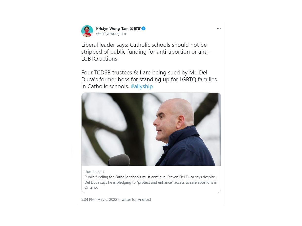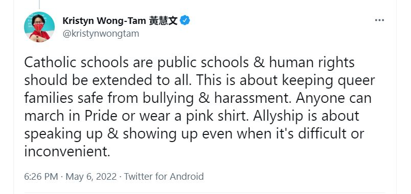 Some candidates are insisting on introducing a phobia of Catholics (who still make up 33% of the population of Ontario) in the campaign by equating it with “homophobia” and “transphobia”. For example, Kristyn Wong-Tam an NDP candidate is tweeting this explicitly in her riding (in the pics above and below, her tweets: click to enlarge them).