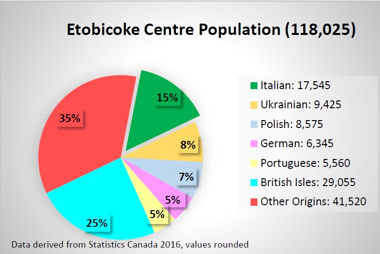 According to the 2016 Census, Etobicoke Centre is home to 118,025 residents. It is a diverse community comprised of several different cultural and ethnic backgrounds. At 15% of the population, Italians represent one of the largest ethnic groups outside of the downtown core. That translates into 17,545 constituents of Italian origin.