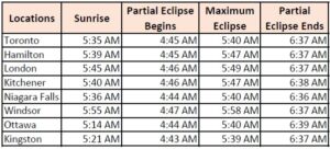 Weather permitting, Torontonians will be treated to a partial eclipse, a “crescent moon” so to speak. The moon will cover about 86% of the sun’s diameter.