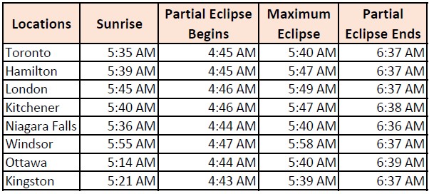 In Toronto, the celestial event will begin shortly before sunrise, at 5:35am, reaching it’s peak at 5:40am and ending by 6:38am. (See chart below)