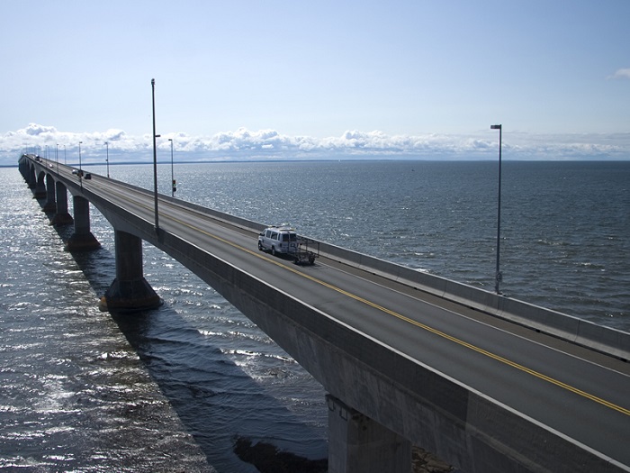 In my lifetime, federal governments have absorbed the majority of investment costs for significant projects like the St. Lawrence Seaway, Maritime ports on the West Coast, Atlantic Coast, ports that require ice-breaking capacities in the Arctic and flights of fancy like the Confederation Bridge connecting Prince Edward Island (population 150,000) to New Brunswick (population 750,000) – in the pic below, from https://www.confederationbridge.com/.