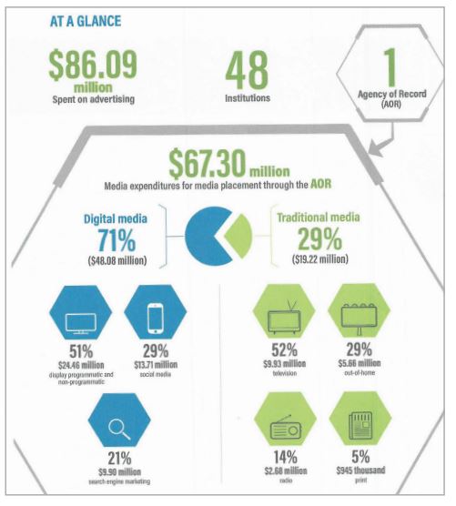 The reality check is that there are 40 million Canadians, so the government spent an average of two dollars and fifteen cents ($2.15) per Canadian to inform its residents. It gets worse. Forty-eight (48) government institutions, (see diagram 1.) “split” those dollars to reach Canadians via traditional (hard copy and over the air), digital (Google, Facebook etc.), and social media.