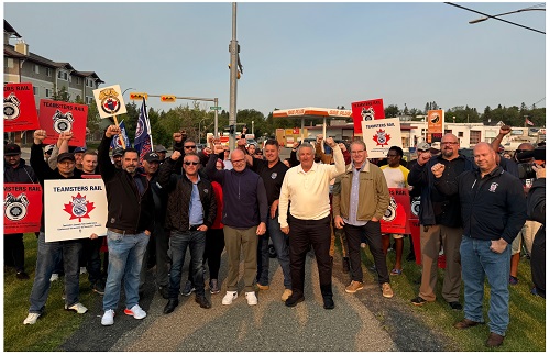 In the pic above: a Teamsters “picket” in front of the CPKC headquarters in Calgary, with François Laporte, president of Teamsters Canada, and Sean O’Brien, president of the International Brotherhood of Teamsters – IBT (photo from Twitter – @TeamstersCanada)