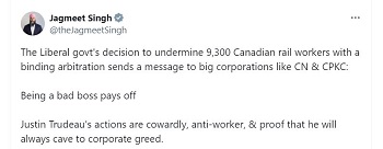 Finally, a curious note at the very least. The leader of the NDP, Jagmeet Singh, who – with his votes – keeps Justin Trudeau’s minority Liberal government alive, published one fiery posts (here below, the screenshot) against “his” prime minister on X – Twitter, after the order to suspend the strike. “The Liberal govt’s decision to undermine 9,300 Canadian rail workers with a binding arbitration sends a message to big corporations like CN & CPKC: Being a bad boss pays off Justin Trudeau’s actions are cowardly, anti-worker, & proof that he will always cave to corporate greed”. Question: why Singh and the NDP still support the Trudeau government?