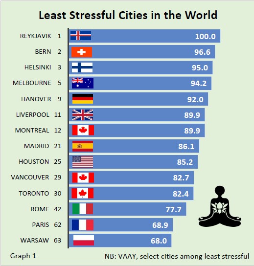 If so, then head for Reykjavik, Iceland, considered the most stress-free city in the world, according to the 2021 Least and Most Stressful Cities Index released by VAAY, a Berlin-based company specializing in (cannabidiol) health products for inner balance and mindfulness. The Nordic city is among the best for clean air, gender equality, a great place to enjoy good health and live stress-free. (See Graph 1 above)