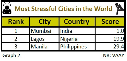 On the flip side, topping the list of the world’s most stressful cities was Mumbai, India, followed by Lagos in Nigeria. Manila, Philippines, rounded out the top three most stressful cities in the world. (See Graph 2 below)