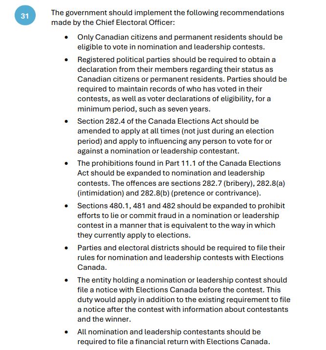 The report then cites Russia, Pakistan and Iran as other countries considered threats of foreign interference for Canada. All interference, however, did not – according to Hogue’s report – influence the outcome of the 2019 and 2021 federal elections. “While any attempted interference is troubling, I am reassured by the minimal impact such efforts have had to date” she wrote, noting “the competence, dedication and experience of the members of Canada’s senior public service and national security and intelligence community” but also adding that the government’s response when it comes to foreign interference has been “far from perfect…” and then she also “scolds” the parties, inviting them in recommendation number 31 (in the screenshot here below) to establish stricter rules on citizen participation in political life (for example, requiring Canadian citizenship or at least permanent residency).