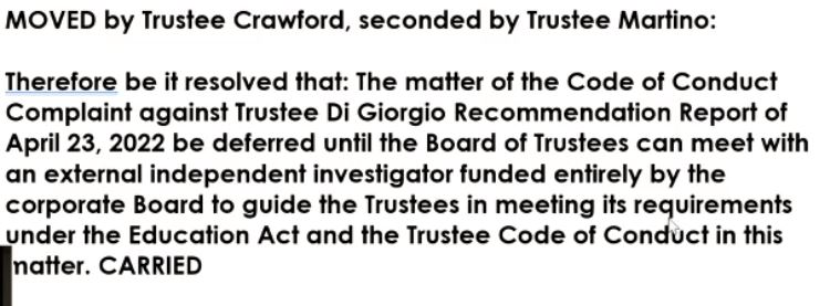 Trustee Di Giorgio was “investigated” for a fabricated, alleged breach of the Trustees’ Code of Conduct for statements wrongly attributed to him by the Corriere and then to sanction him accordingly. This tactic had been used in late 2020 to besmirch trustee Del Grande and reverse a previous finding of innocence on a case brought against him, without going to judicial review as required by law.