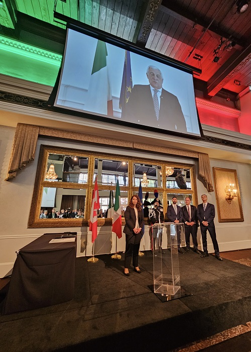 After the welcome in the room, and after the inevitable Mameli Hymn (in the video above) performed by the string quartet, the interventions of the authorities began: the Minister of Education of Ontario, Stephen Lecce, spoke and the Consul General Luca Zelioli (in the two videos below).