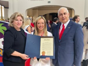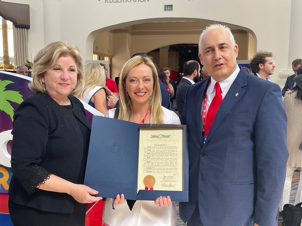 On the occasion of her visit in the US, Giorgia Meloni also received the “Proclamation” from the Texas Senate on the proposal of Senator Jane Nelson: in the pics here below, some moments of the awarding of the honor, in the presence of the American senator Nelson and Vincenzo Arcobelli, member of the CGIE (Consiglio Generale degli Italiani all’Estero – General Council of Italians Abroad) and president of CTIM, the Tricolor Committee for Italians in the World – Comitato Tricolore per gli Italiani nel Mondo (click on the images to enlarge).