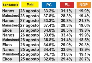 TORONTO – Cambiano i rapporti di forza tra i partiti. All’inizio della terza settimana di campagna elettorale i conservatori consolidano il vantaggio sul Partito Liberale, rovesciando completamente gli equilibri nelle intenzioni di voto in vista della tornata elettorale del prossimo 20 settembre…
