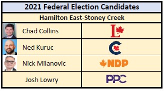In May 2021, Bratina announced that he will not run in this election following policy differences with his leader. It is now up to Liberal candidate Chad Collins, a city councillor for Ward 5 since 1995, to win back support for the Liberals in the riding.