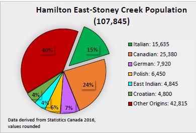 Hamilton is characterized as an established and aging immigrant population. Roughly one in four people in the district were born outside of Canada. Italians represent one of the largest ethnic groups at 15% in the Hamilton East-Stoney Creek electoral district. According to the 2016 Census, 15,635 constituents are of Italian heritage, representing the highest concentration of Italians among all districts in Hamilton.