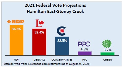 According to the latest projections by 338Canada.com (August 21), which uses algorithms that take into account results of all major polls, the NDP are ahead of the Liberals by 4.1%.