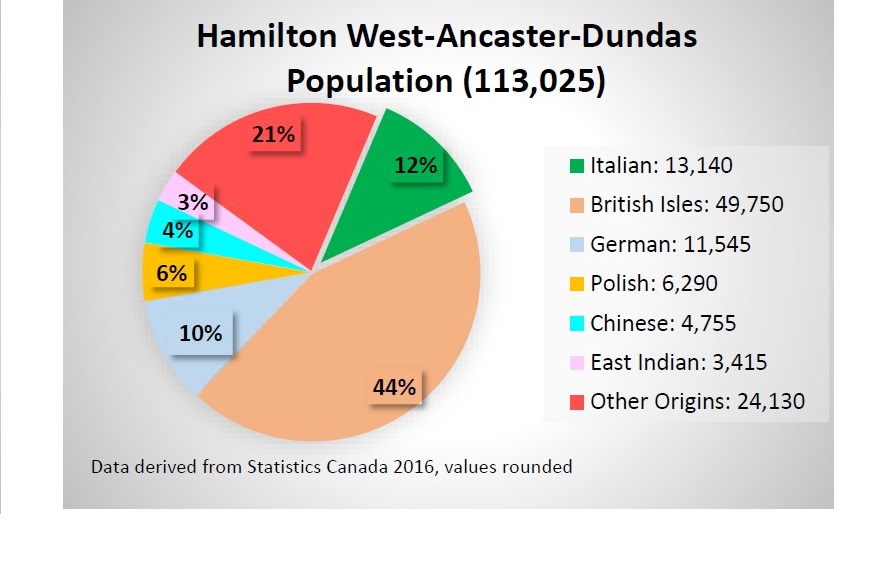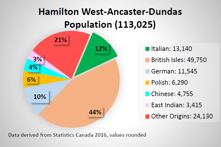 Historically, the Hamilton area has been popular among immigrant groups, most notably those originating from Europe. Therefore, it is not surprising to find that Italians make up 12% of the district’s population. That translates into 13,140 residents of Italian heritage in the district of Hamilton West-Ancaster-Dundas.