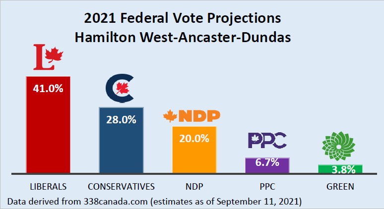 According to the latest projections by 338Canada.com (September 1), which uses algorithms that take into account results of all major polls, the Liberals, at 41%, are ahead of the Conservatives by 13 points. The NDP, at 20%, trail the Conservatives by 8 points.