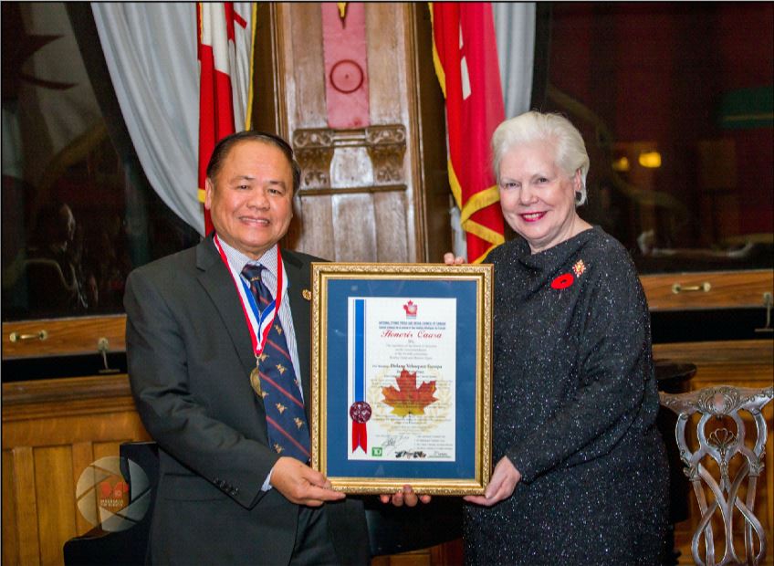 In the pic by Ricky Castellvi, Delano Europa, Justice of Peace of Ontario presiding at Toronto receives an award from the Hon. Elizabeth Dowdeswell, Lieutenant Governor of Ontario and the National Ethnic Presso and Media Council of Canada for community service, social justice advocacy and humanities on November 4, 2016
